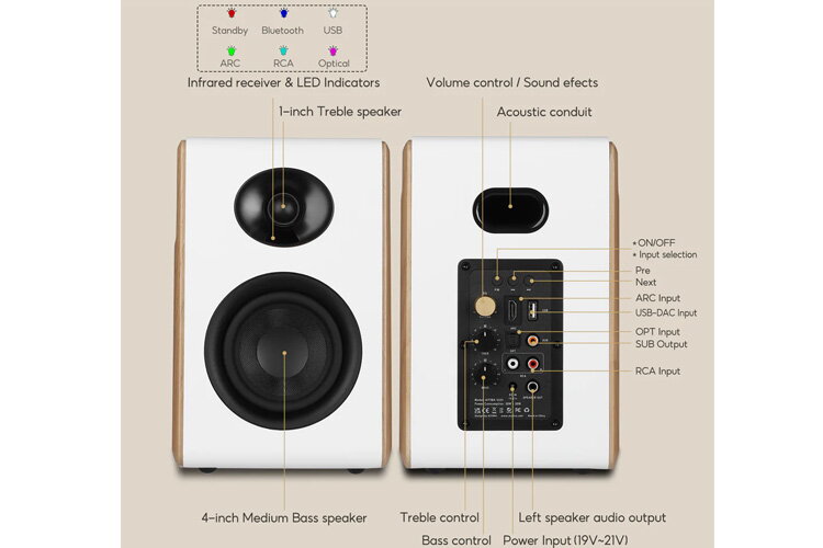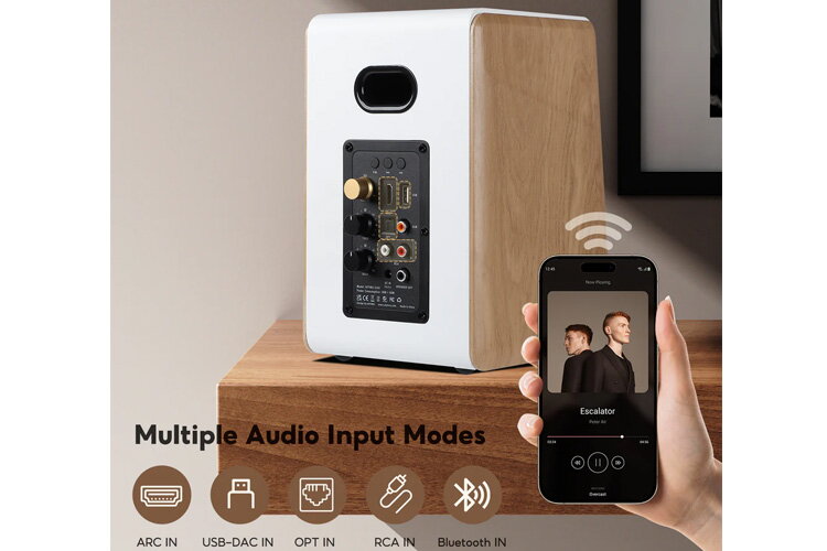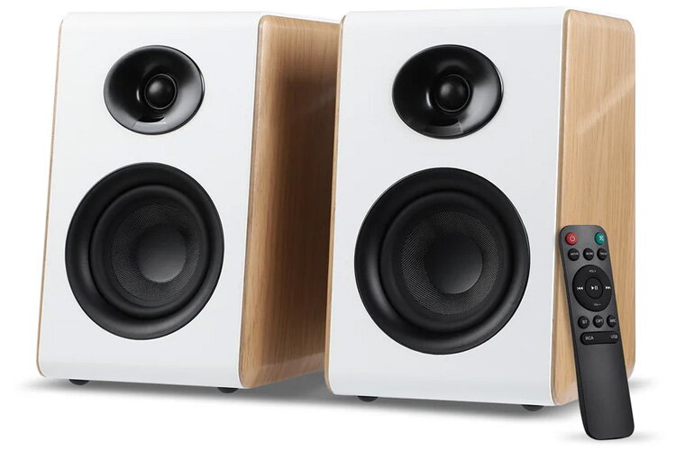 - Stylish Build: Pair of speakers made from MDF/ABS with a Scandinavian white-and-wood finish.