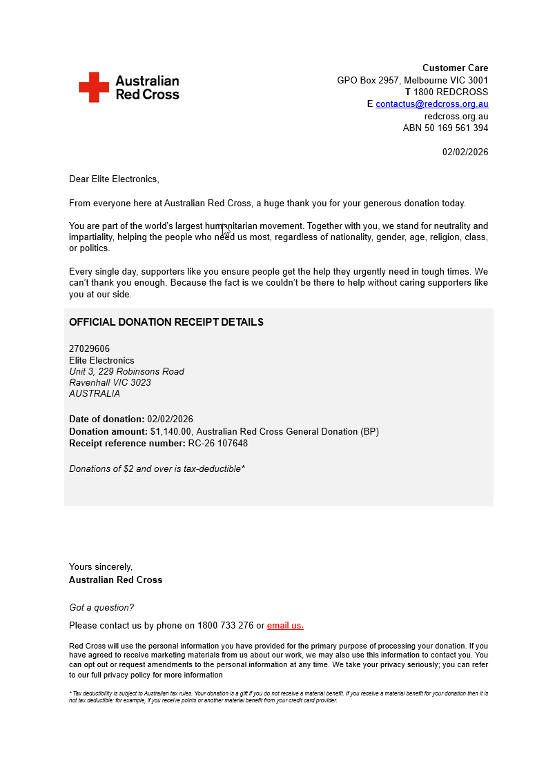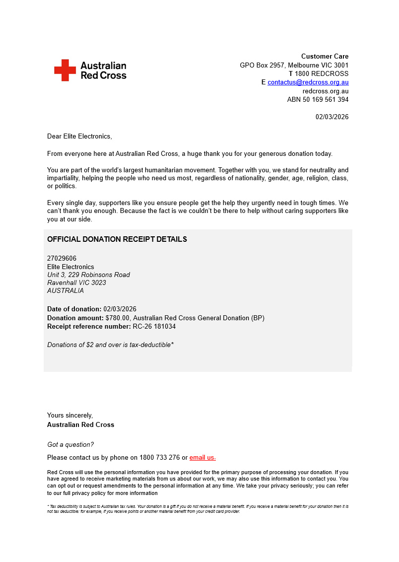 On behalf of the Australian Red Cross and Elite Electronics, THANK YOU for your support.