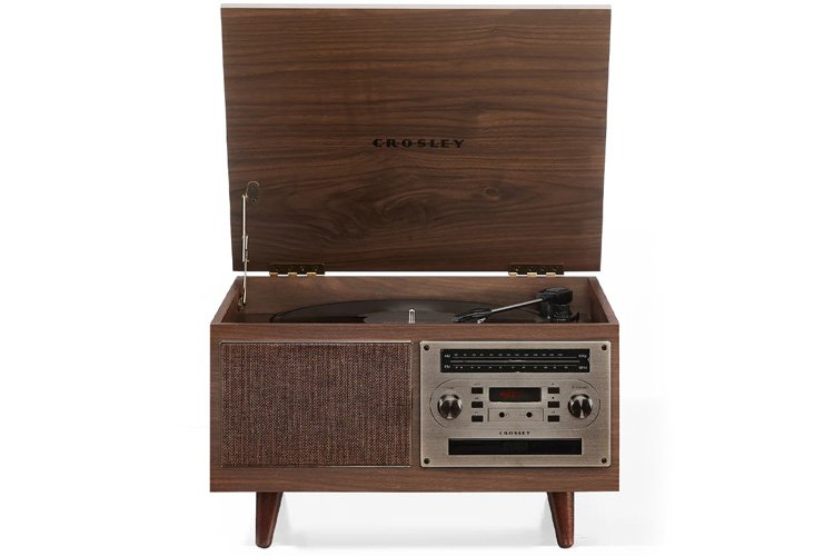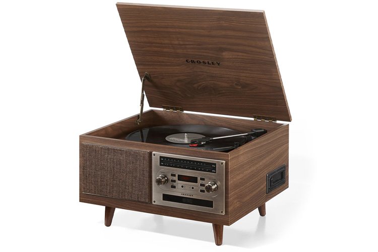 Enjoy a three-speed belt-drive turntable (33 1/3, 45, 78 RPM) with a cueing lever, auto stop, and a 45 RPM adapter. Plus, listen to CDs, cassettes, and AM/FM radio, or connect your device via aux input or the headphone jack.