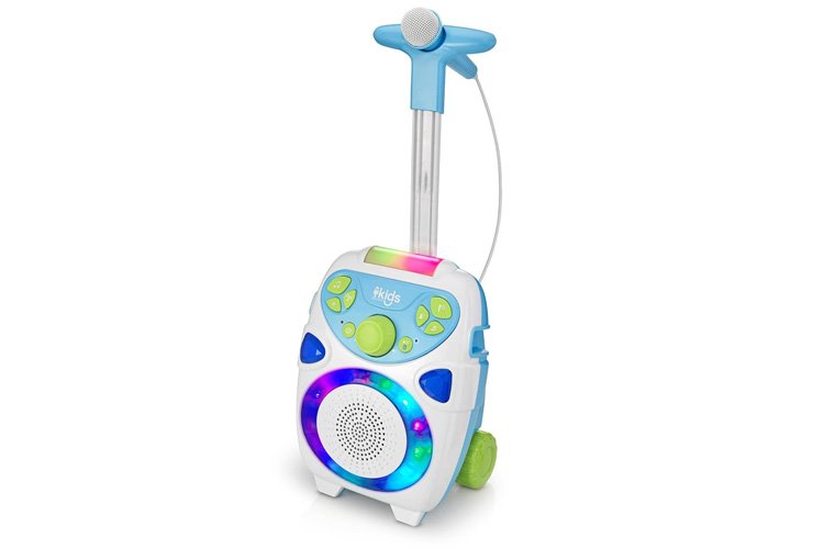 - Wheels & retractable handle that doubles as microphone stand to move & sing anywhere