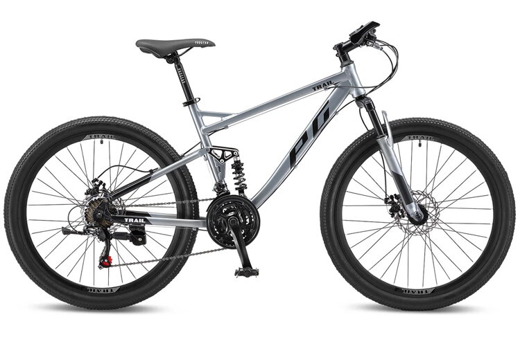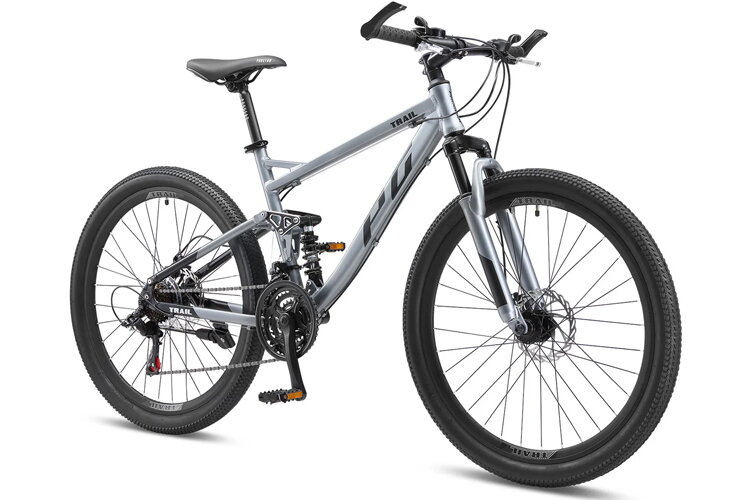 The Progear Trail Dual Suspension Mountain Bike in Shadow is built for durability and performance on demanding terrains. Featuring a full suspension system and a 21-speed Shimano drivetrain, this bike delivers a smooth, responsive ride while maintaining excellent traction and stability on rocky or uneven paths.
