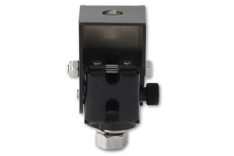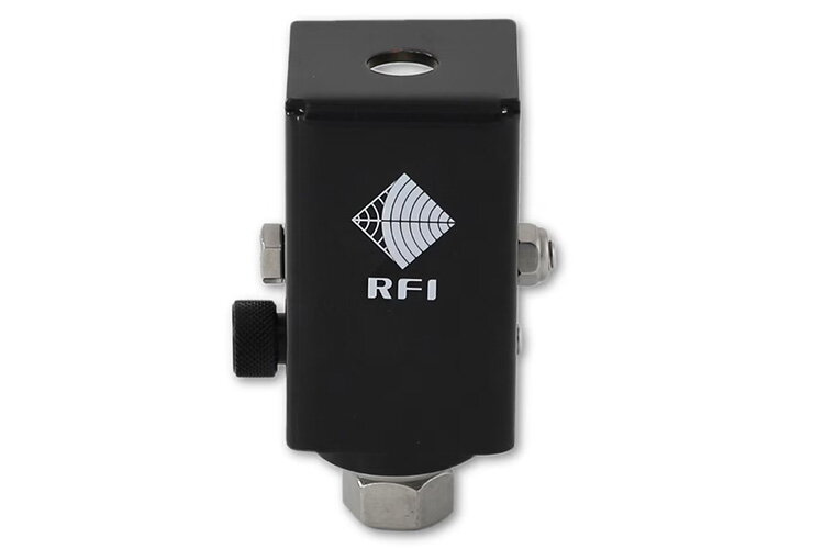 The RFI FBBM-B-V2 is a heavy-duty folding mounting bracket made from 304-grade stainless steel, designed for easy mounting of UHF CB or mobile phone antennas on bull bars. It supports fold-down from vertical to horizontal for clearance in low garages or car parks.