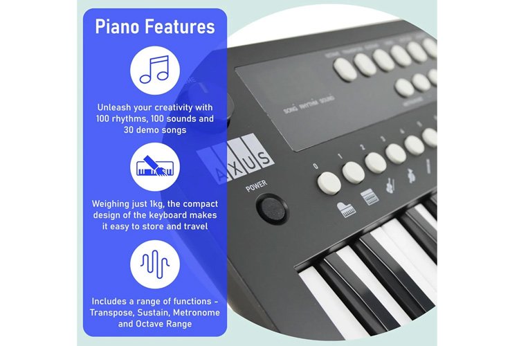 Whether you're beginning your musical journey or need a space-saving practice instrument, the Axus Mini Keyboard delivers portability, ease of use, and a wide range of musical options.